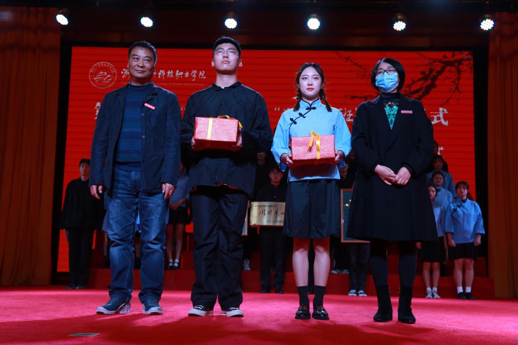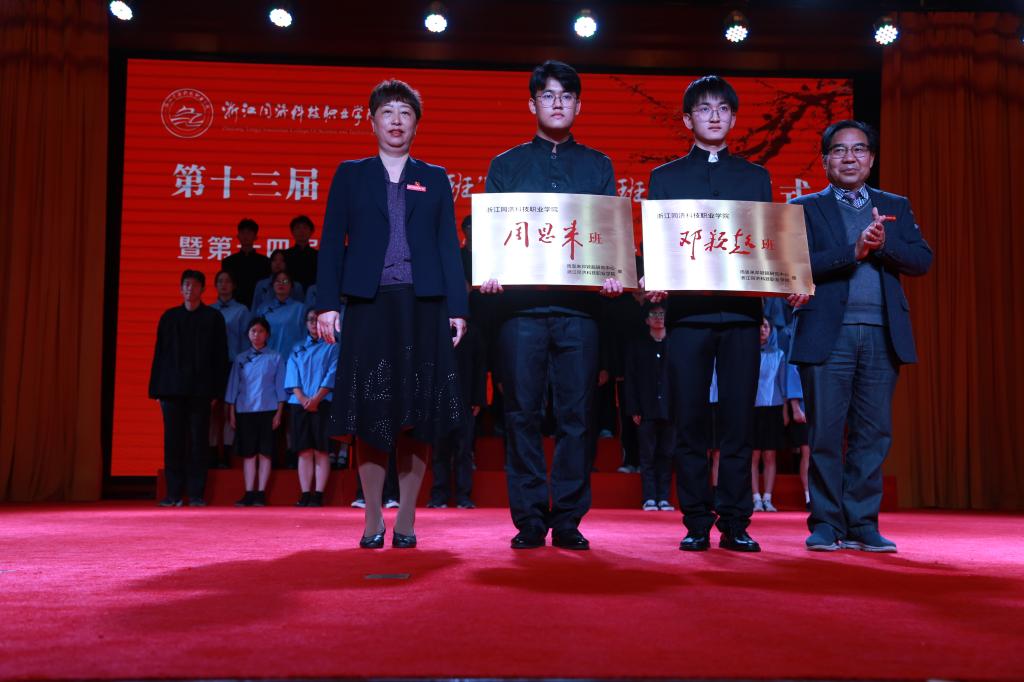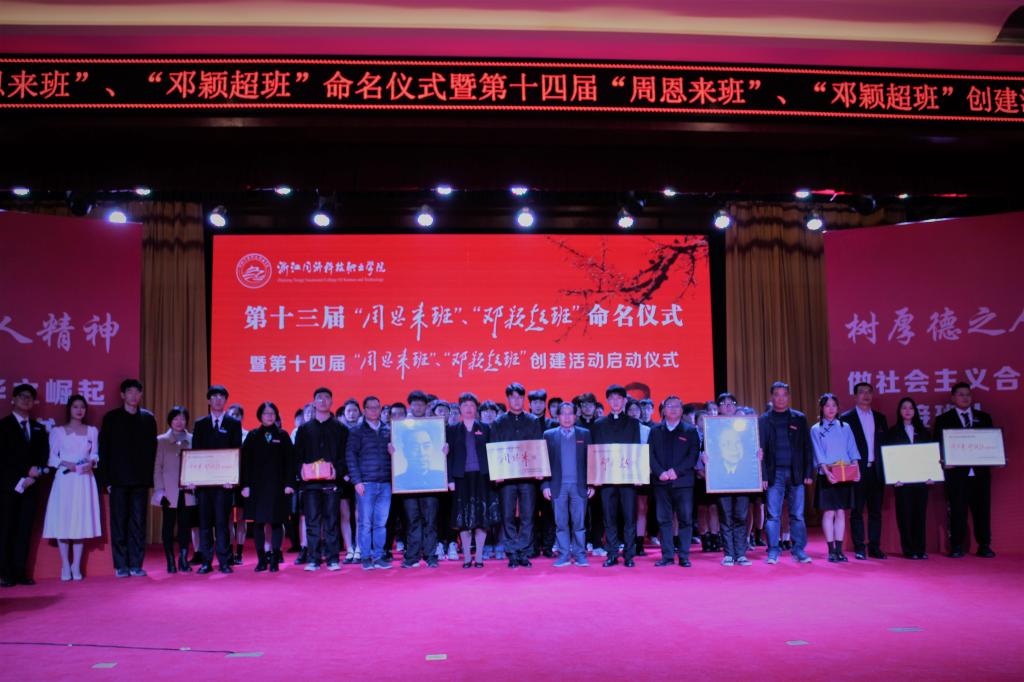 仪式开始,在庄严的国歌声后,全体人员向周恩来、邓颖超像深深鞠躬表达缅怀之情。紧接着与会人员通过视频,共同回顾了学校“周恩来班”“邓颖超班”十三年的创建历程,校长梁国钱宣读了命名文件。随后,学校党委书记江影、校长梁国钱为第十三届“周恩来班”“邓颖超班”授铜牌;校党委副书记、副校长吴宏平,校党委委员、副校长沈自力为第十三届“周恩来班”“邓颖超班”赠像;校党委委员、纪委书记应芬,校党委委员、副校长朱兆平为第十三届“周恩来班”“邓颖超班”赠纪念章;校党委委员、组织部部长吴玲洪,校党委委员、宣传部部长吴敏启为第十三届“周恩来班”“邓颖超班”创建奖班级授牌。
