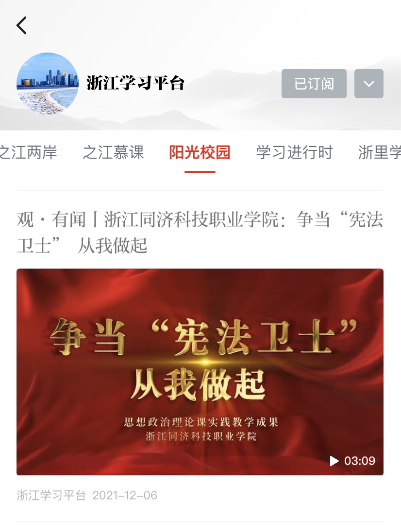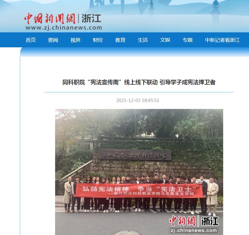 12月3日,在国家宪法日来临前,中国新闻网以《同科职院“宪法宣传周”线上线下联动 引导学子成宪法捍卫者》为题,报道我校师生宪法宣传主题活动。6日学习强国播放了我校宪法宣传的专题视频。