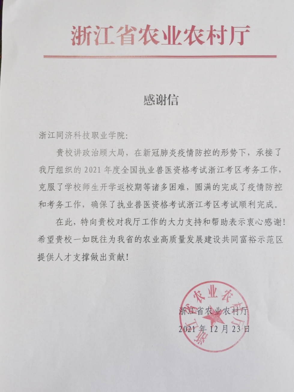 近日,我校收到来自浙江省财政厅、农业厅的感谢信。财政厅在信中对我校在疫情防控的严峻形势下,讲政治顾大局、高站位勇担当,积极承接注册会计师全国统一考试表示了感谢。农业厅在信中对我校承接全国执业兽医资格考试,克服师生返校等诸多困难,圆满完成疫情防控和考务工作表示了感谢。