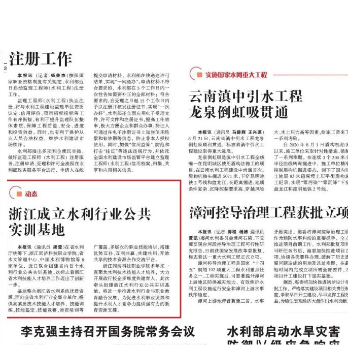 2022年7月1日,《中国水利报》以《浙江成立水利行业公共实训基地》为题,报道我校在省水利厅指导下,牵头成立浙江省首个水利行业公共实训基地。