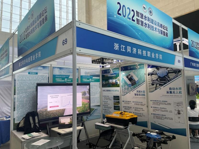 会场同步设置智慧水利建设技术与装备展,我校重点展示了水利工程管理技术实训平台、河湖水面智能保洁船和自动水样采集无人机等产品和解决方案,吸引了不少业内领导、专家的莅临指导与认可。本次技术与装备展涉及智慧防洪减灾、水利工程智能施工、水利水电智慧运维、互联网+城乡供水一体化、智慧节水、智慧灌溉、智慧河湖管理、智慧水文监测、智慧水土保持、水利监督、水资源、水环境、水生态等主题,为全面推进算据、 算法、算力建设,建设数字孪生流域和数字孪生水利工程,加快构建具有“四预”功能的智慧水利体系提供广阔平台。