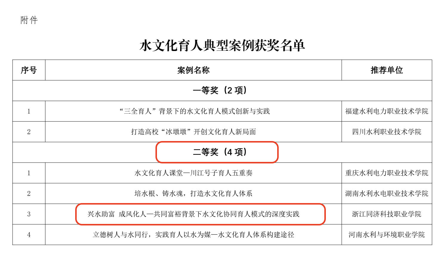 近日,中国水利教育协会公布了第二届水利职业院校水文化育人典型案例遴选结果,我校宣传部推荐、水利工程学院党总支选送的《兴水助富成风化人——共同富裕背景下水文化协同育人模式的深度实践》,荣获大赛二等奖。