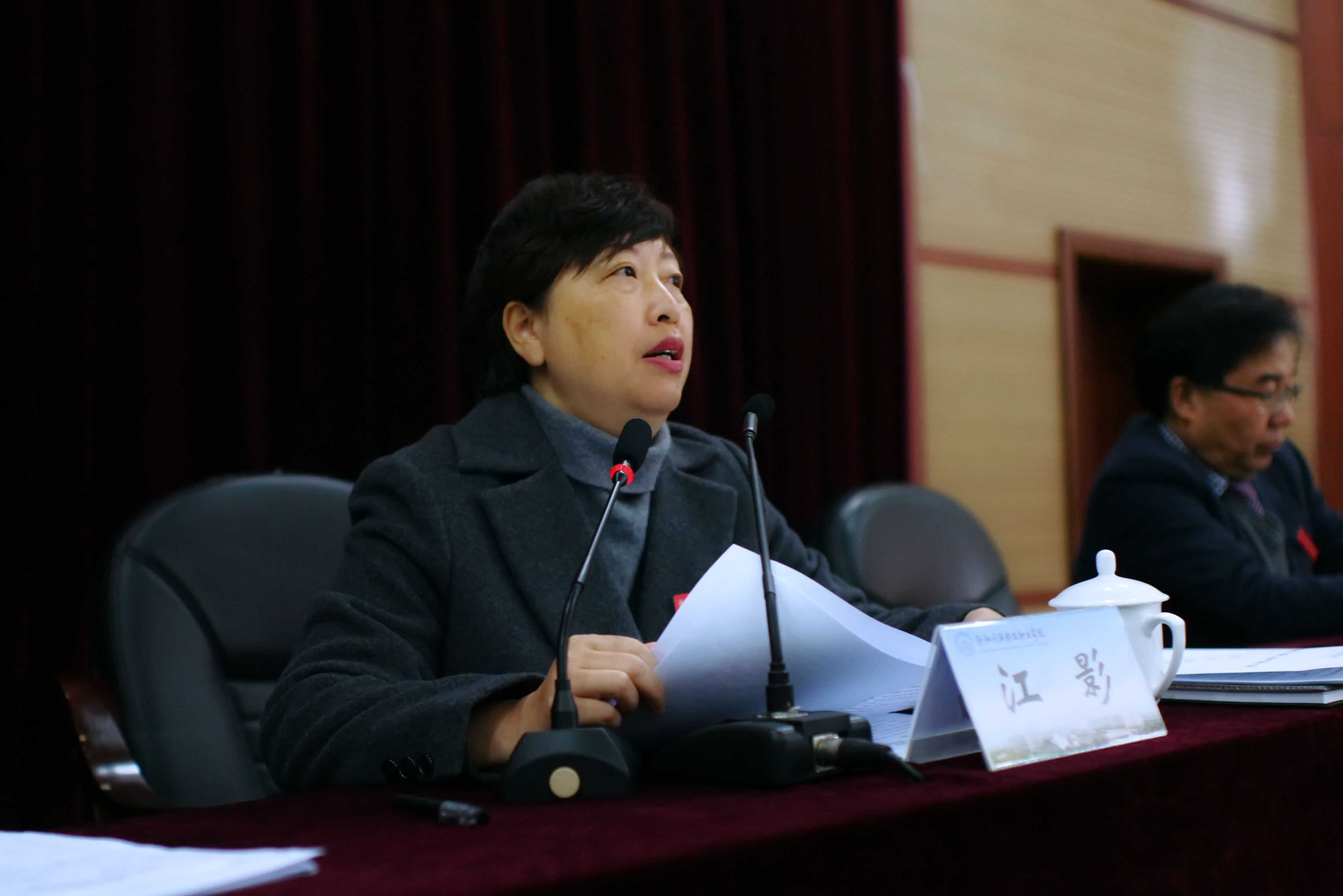 党委书记江影讲话。她指出要围绕深入学习贯彻习近平新时代中国特色社会主义思想,深化产教融合,促进教师队伍改革,推动学院科学快速发展。她强调重点要从五个方面做好2018年工作。一要积极开展全国水利行业优质高职院校和优质水利专业建设申报工作;二要全面启动内部质量保证体系诊断与改进工作;三要以有关制度修订为抓手,提高教职工干事积极性;四要推进“最多跑一次”改革,加大信息化建设力度;五要加强作风建设,确保各项目标任务完成。她指出要保质保量完成2018年各项任务,作风建设至关重要,希望广大教工特别是党员干部持之以恒正风肃纪,领导干部率先垂范,切实加强师德师风建设,把个人发展与学校发展融合在一起,增强责任感和使命感,与学校同呼吸、共命运。