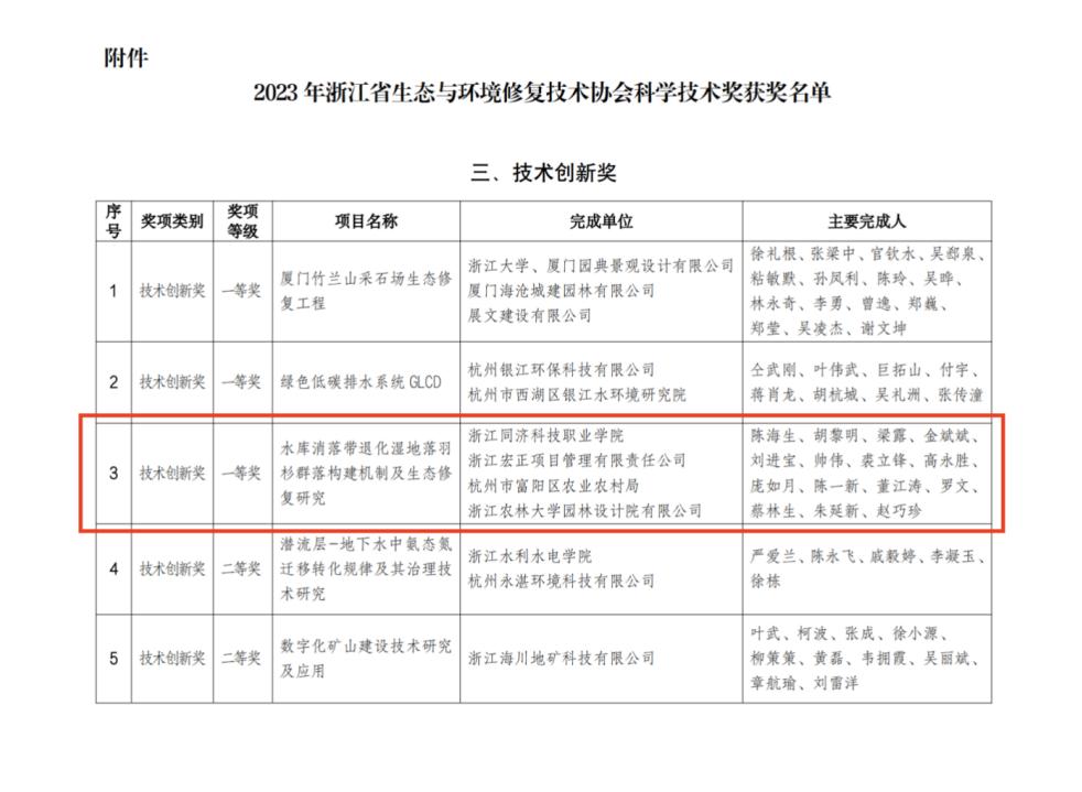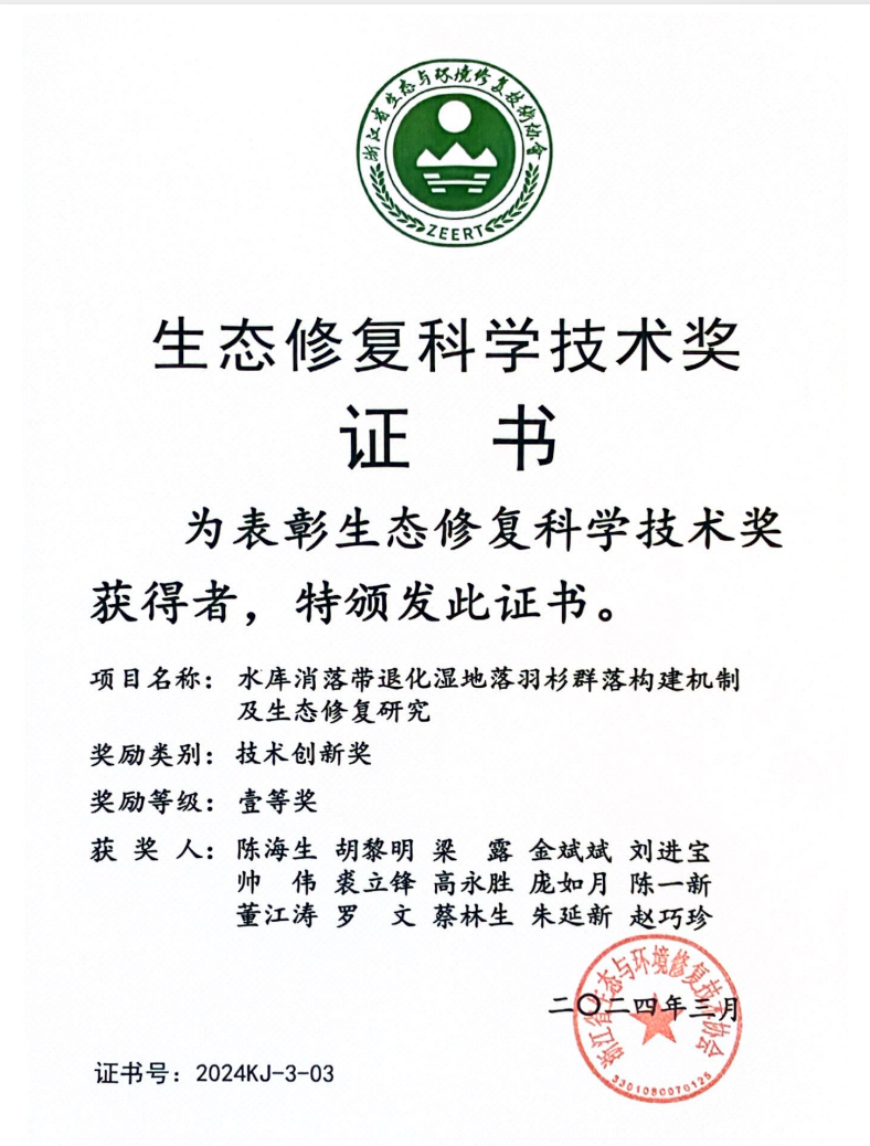 近日,浙江省生态与环境修复技术协会发布浙江省生态修复科学技术奖获奖名单。我校陈海生博士团队的项目《水库消落带退化湿地落羽杉群落构建机制及生态修复研究》获技术创新奖一等奖。