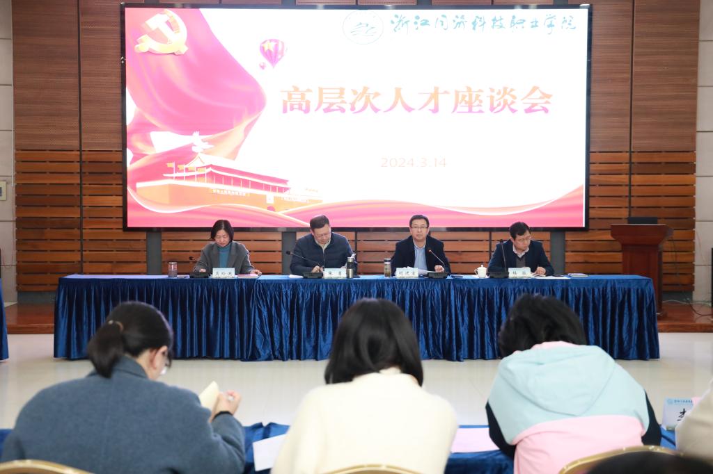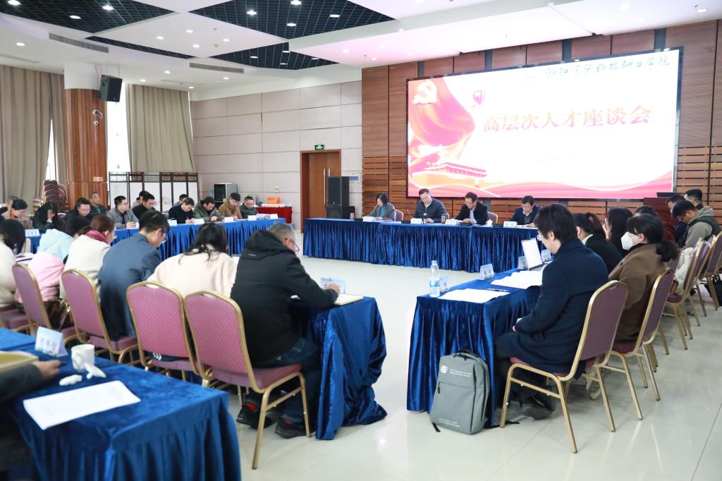 在全省上下认真学习浙江省委新春第一会精神,贯彻人才强省战略,全面加强“三支队伍”建设之际,3月14日,学校在行政楼三楼多功能厅召开高层次人才座谈会,来自学校6个二级学院的39位高层次人才参加座谈,学校党委书记张勇,党委委员吴玲洪,党委委员、组织部部长楼骏出席座谈会,相关职能部门与各二级学院负责人参加会议。会议由学校党委委员、副校长刘进宝主持。
