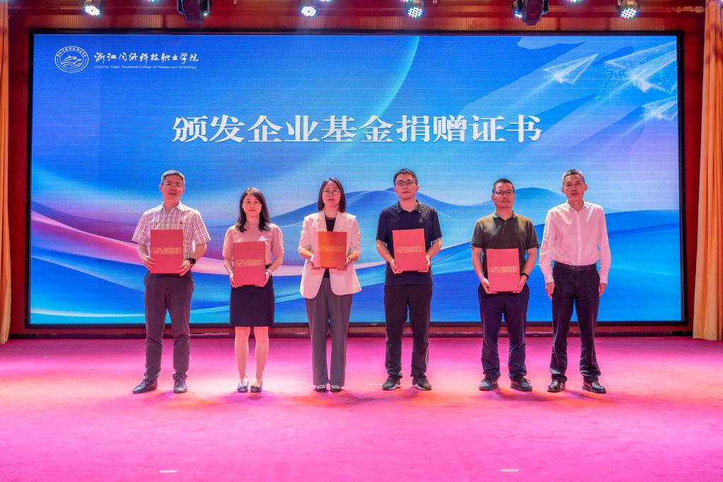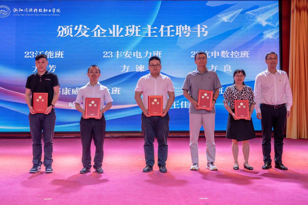 随着学校及浙江江能建设有限公司、杭州丰安电力建设有限公司、杭申集团杭州之江开关股份有限公司、上海三菱电梯有限公司浙江分公司、杭州海康威视电子有限公司等领导共同点亮启动屏幕,第四届校企共同体班级共建新征程正式开启。王卫标校长为合作企业颁发捐赠证书,刘进宝副校长为企业班主任颁发聘书,合作企业领导为共建班授牌并讲授具有企业特色的“开班第一课”。