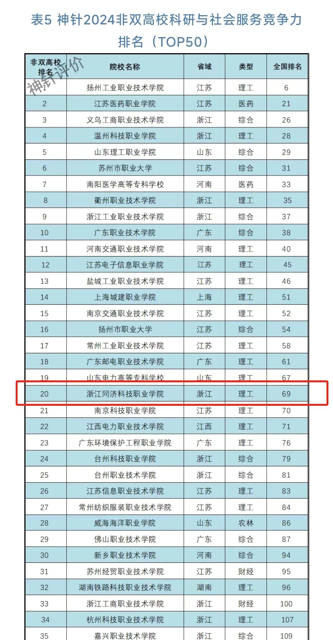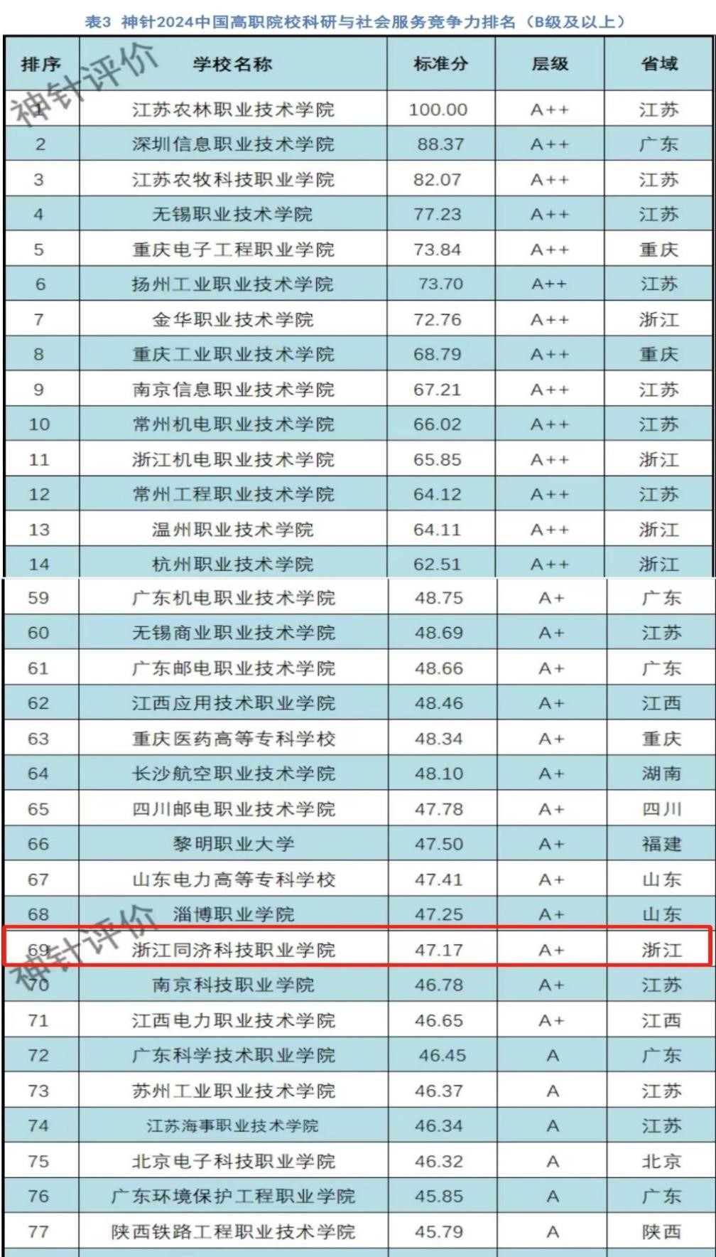 近日,神针评价(SZPJ)发布《2024中国高职院校科研与社会服务竞争力排名》。榜单对全国1414所高职院校提交的2023年度职业教育质量年度报告进行科学评价,我校位居全国第69名、全省第14名,继续保持在A+层级(2023年位居全国第72名),在全国非双高校科研与社会服务竞争力排名第20名、全省第5名。