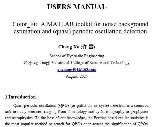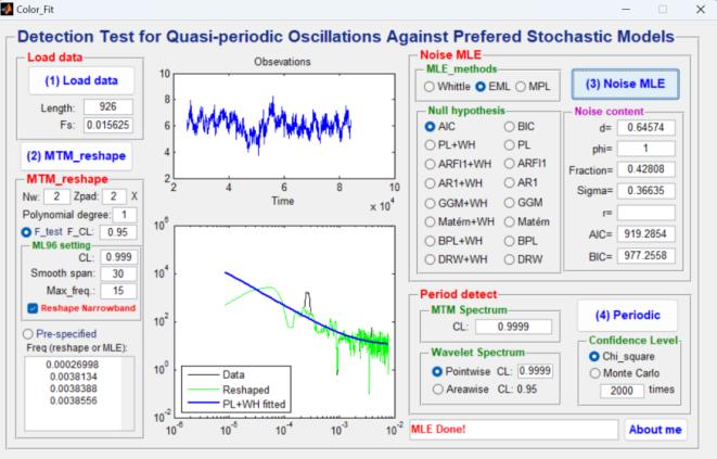 论文引入广义Gauss-Markov模型,采用分数阶差分法构造多种有色噪声的协方差阵,结合优化后的函数模型,提出了一种顾及最优噪声背景的QPO探测方法。该论文配套开发了Color_Fit软件(如图),以进一步拓展多窗谱方法(MTM)和小波在天文、地学、气候和旋回地层领域QPO显著性检验的应用,并将随机模型由传统的AR1扩展至ARFIMA(1,d,0),GGM,PL,Broken PL和Matérn等,有望弥补当前一些主流软件的不足。