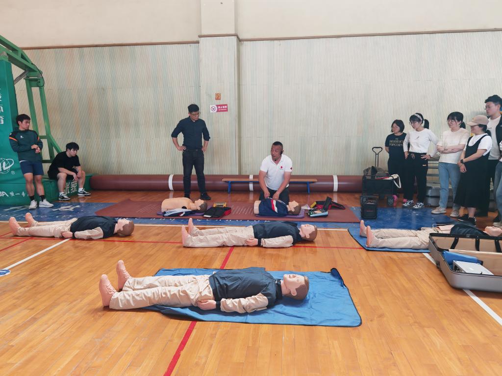 培训活动以“理论+实操”的形式展开。李波针对校园常见突发事件,系统讲解了心肺复苏术、AED使用等急救核心技术。通过真实救援案例的生动剖析,深入浅出地阐释了“黄金4分钟”在急救过程中的决定性作用。理论培训结束后,参训师生分组前往文体中心篮球馆进行实操演练,现场学习氛围热烈。