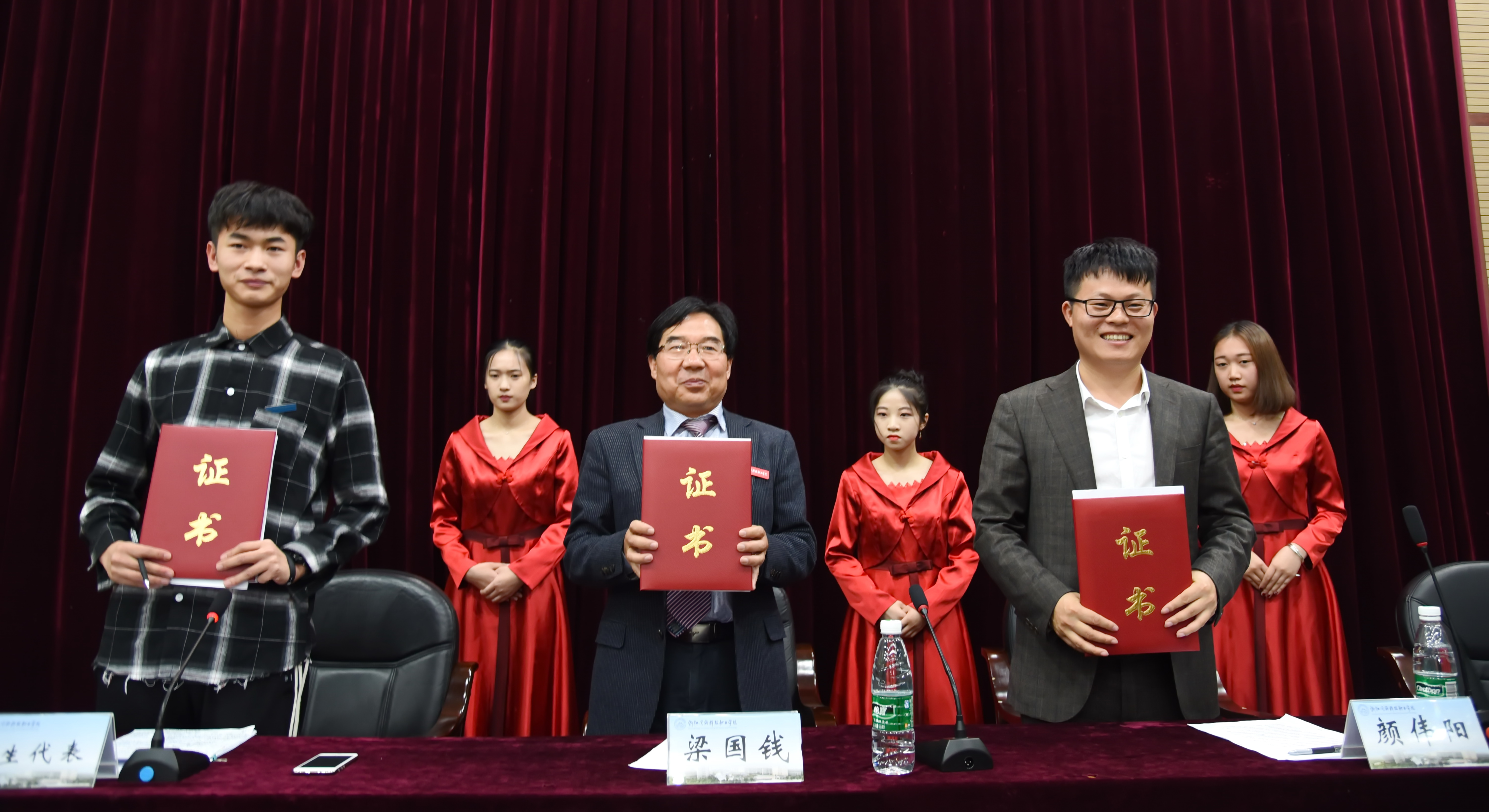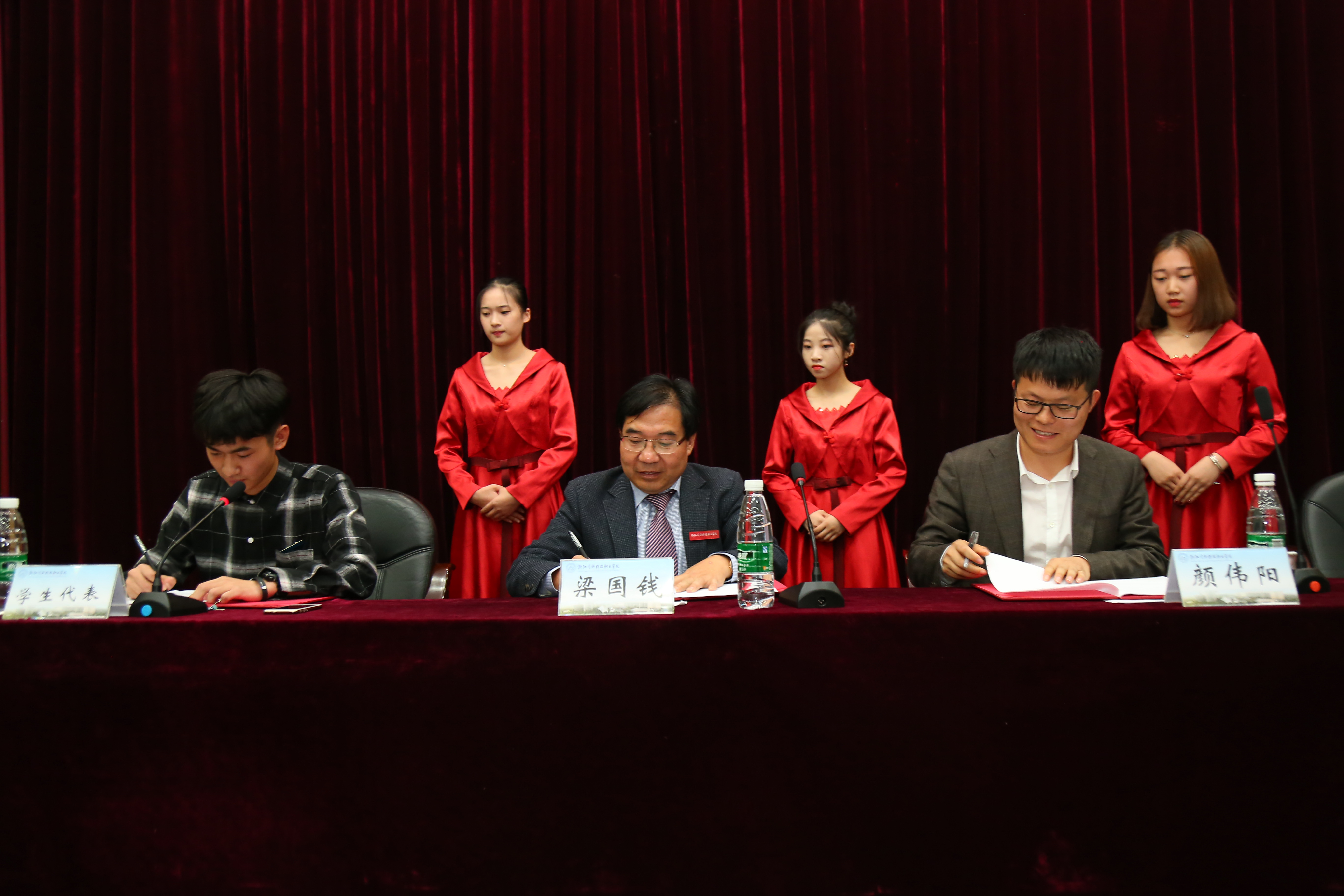 院长梁国钱、董事长颜伟阳、学生代表曹钱烽签订三方协议