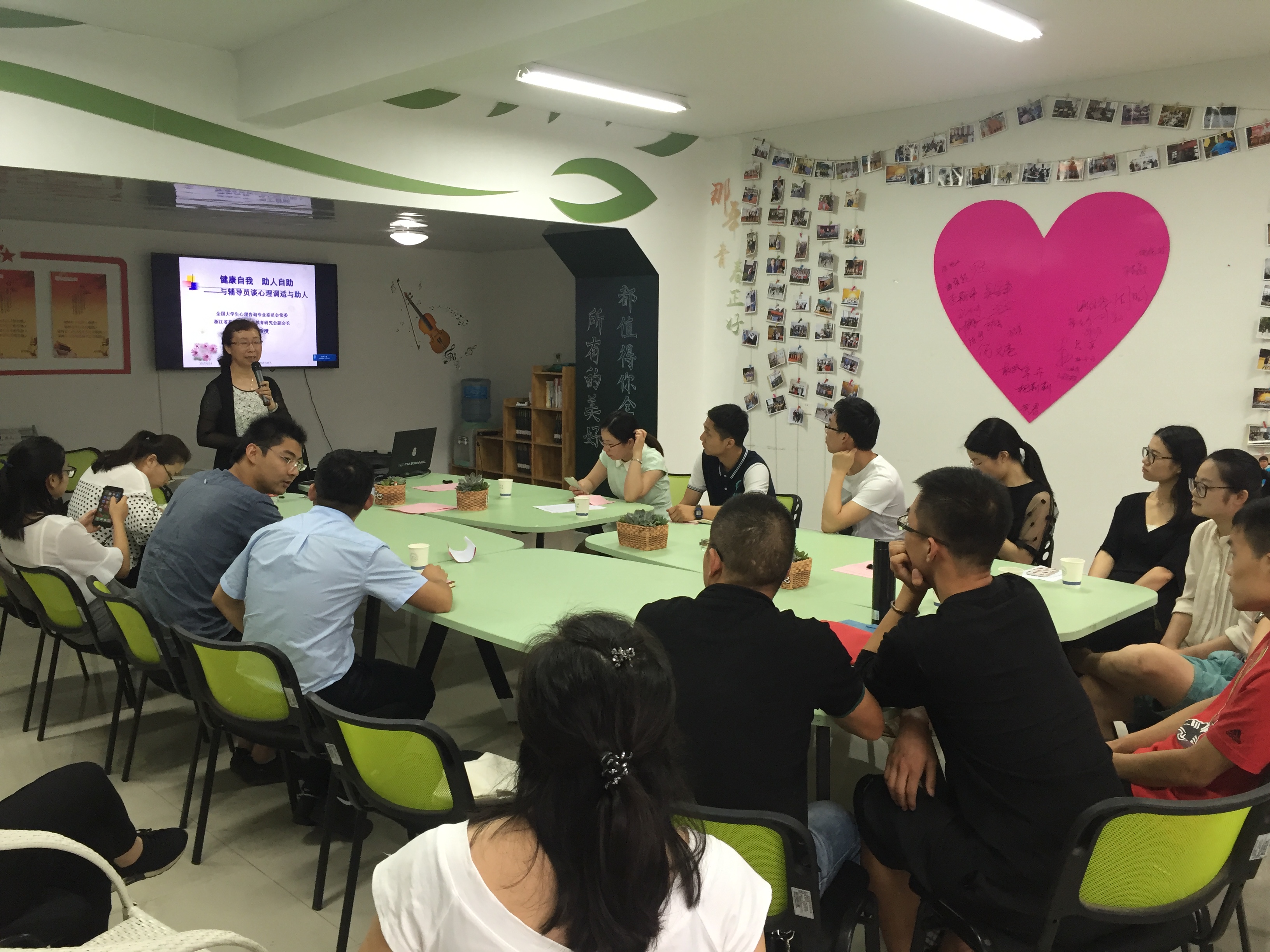 揭牌仪式结束后,学工部组织了第三期辅导员思享汇,邀请了浙江大学王东莉教授做了名为“健康自我,助人自助——与辅导员谈心理调适与助人”的讲座。王教授从“心理健康与辅导员工作的关系”谈起,运用心理学中的ABC理论,结合危机干预事例,深入浅出的让在座的辅导员们明白了自己的认知会对心理健康状况产生多么大的影响,并总结了辅导员助人的基本能力要求和助人原则:尽力而为,助人自助;善于倾听,积极关注;真诚友善,平等尊重;认真负责,严格保密。