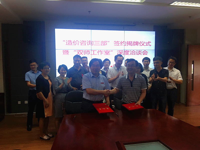 仪式上,梁国钱院长和刘国清副总经理分别代表双方签署了合作协议,并为造价咨询三部揭牌。
