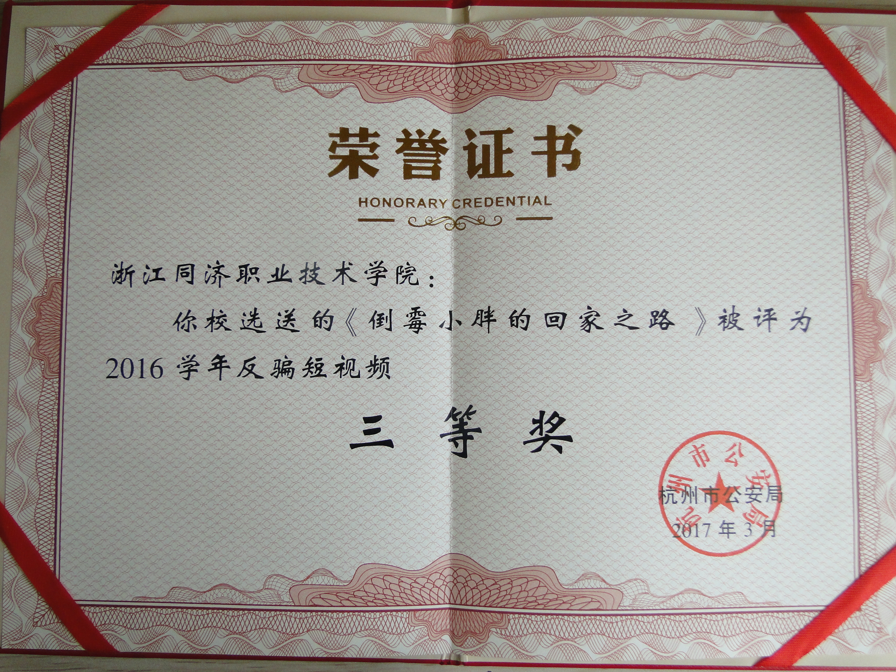 日前,杭州市公安局下发了《关于对全市学校2016学年优秀反诈骗短视频进行表彰的通报》(杭公保【2017】11号)的文件,我校被授予组织开展反诈骗短视频制作及宣传活动优秀组织奖。推送的反诈骗短视频作品《倒霉小胖的回家之路》(水利系制作)获三等奖。