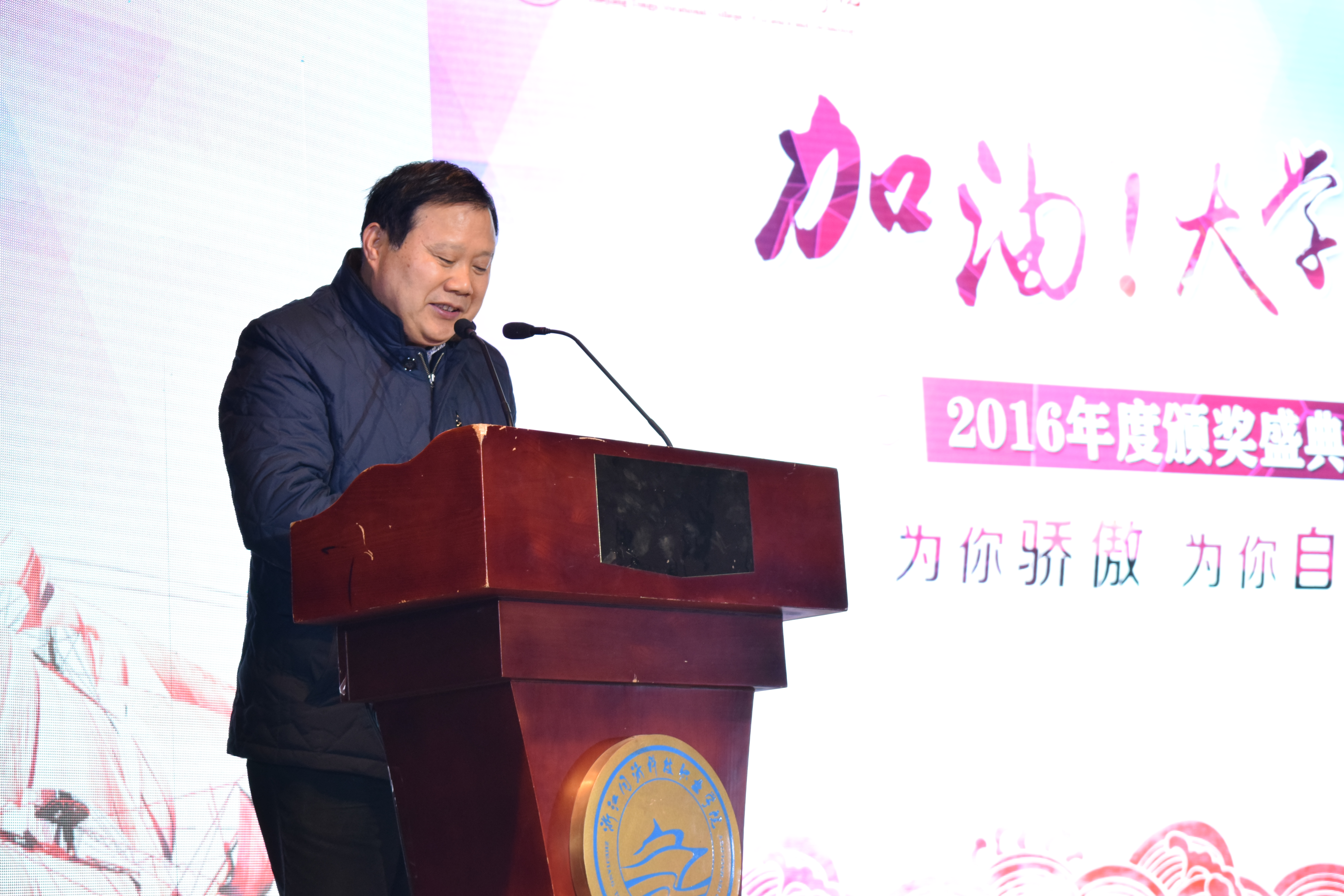12月28日下午。加油!大学生!2016年度颁奖盛典,正式开幕!出席此次典礼的领导有学院党委书记丁坚钢,学院院长梁国钱,学院党委委员、副院长吴宏平,学院党委委员、副院长沈自力以及学工部、后勤服务中心、团委、各系党总支相关负责人
