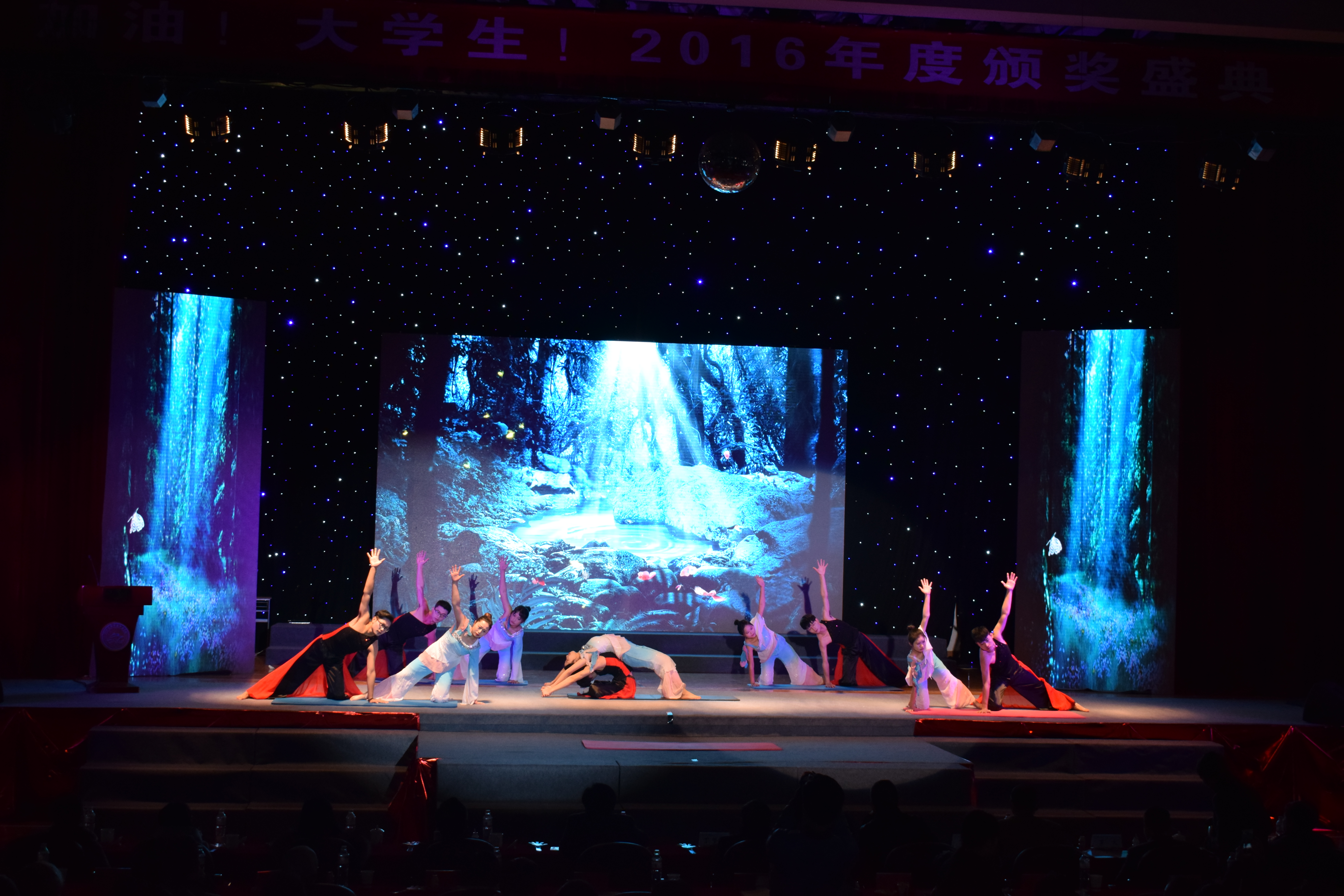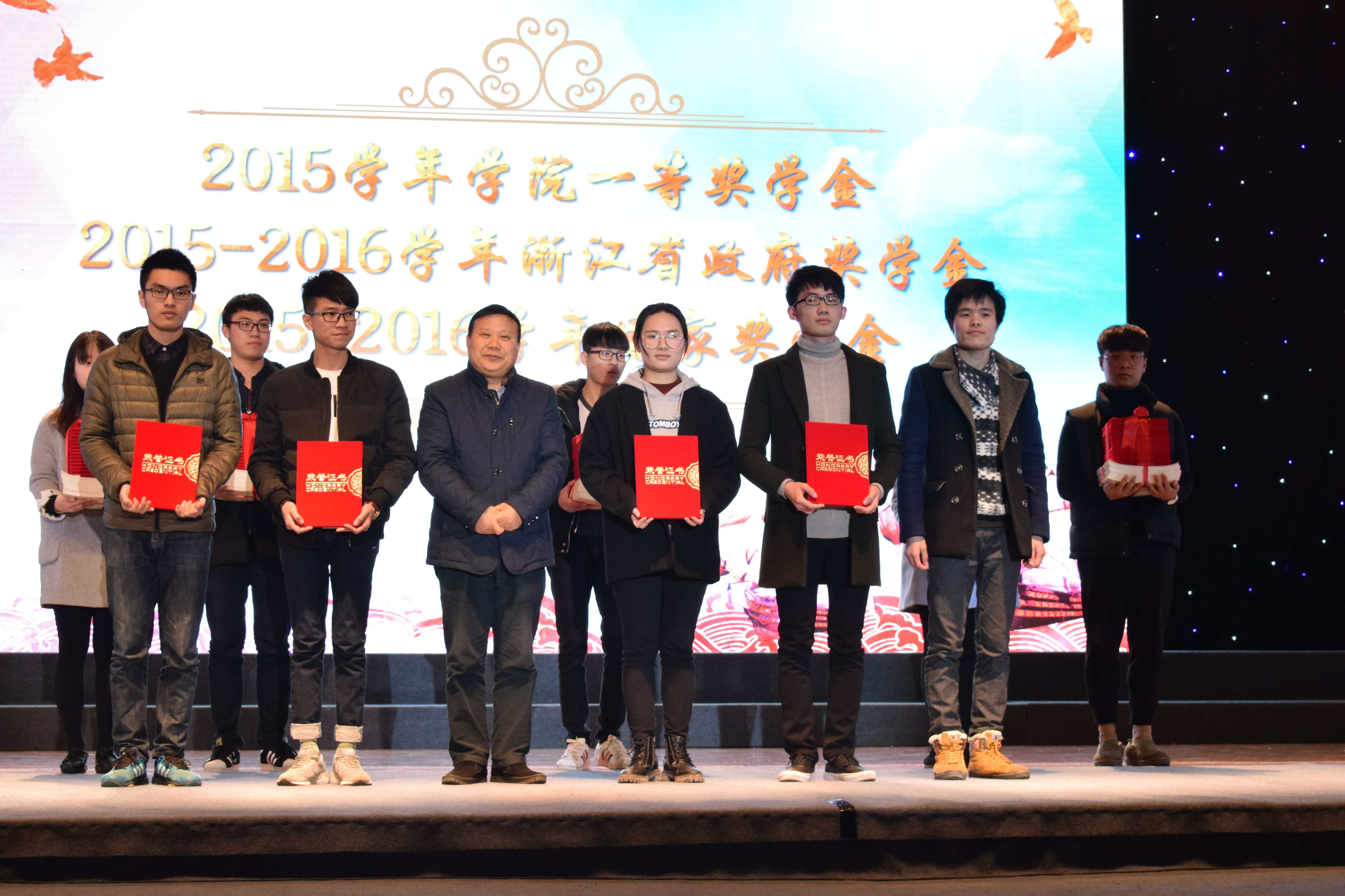 随着街舞《partition》的热辣开场,主持人宣布颁奖盛典开幕,接下来由学院党委书记丁坚钢老师上台致辞。丁书记对获奖的集体与个人发自内心的恭喜,也对学院的2017给予深深的祝福。随后,在各颁奖嘉宾风趣多彩的颁奖下,此次晚会先后颁发了2016年度十佳社团、2016年度五星级寝室、2016年度十佳大学生、2015-2016年第一学期学风优良班、2015-2016年第二学期学风优良班、2015学年学风示范班、2015学年一等奖学金、2015-2016学年浙江省政府奖学金、2015-2016学年国家奖学金等9个奖项。其中穿插由获奖集体和个人带来的节目表演《武之梦》、《木槿昔年》、《雷人舞》、《小幸运》都让同学们大饱眼福,优扬的《但愿人长久》以及充满活力的学生干部带来的《重返十七岁》更是将典礼气氛推向高潮。最后随着新年礼包的放送,加油大学生2016年度颁奖盛典圆满落幕!