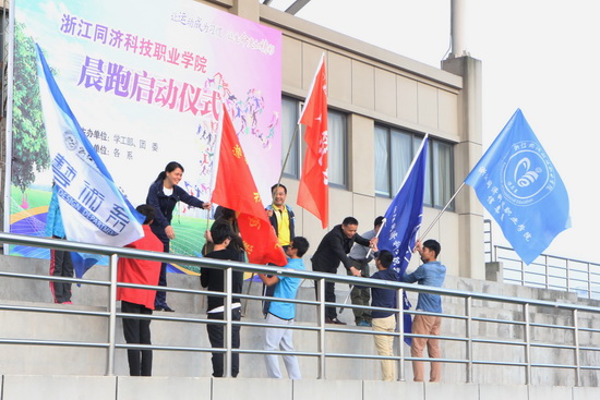 学工部部长金永琪上台宣读学院晨跑活动的纪律要求。院学生会副主席,建管14-01班郑仰政同学作为学生代表上台宣读倡议书。各系党总支书记为各系晨跑队伍授旗。