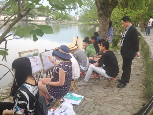 4月27日,学院副院长刘志华带领后勤公司、学生处相关人员,在艺术系负责人陪同下前往安徽黟县宏村,看望并慰问了正在那里写生的104位2014级环境艺术专业师生。