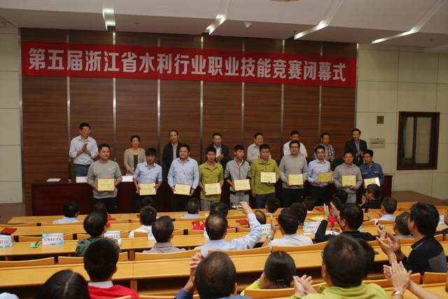 冯强副厅长致闭幕词。他首先向全体获奖人员和获奖单位表示祝贺。他指出,水利系统技术工人是推进实施“五水共治”的强大支撑力量,是浙江水利工作的基石和栋梁,我们要高度重视水利技能人才的培养和使用,大力营造技能人才健康成长的良好环境,为更多更快地培养高水平技能人才而不懈努力。他强调,要深入开展改善技能人才成长环境的研究,不断完善高技能人才队伍建设的政策措施;要不断完善技能人才成长的激励机制,加强对一线操作人员的岗位培训;要加强水利工程管理信息化条件下的专业实训和专业技能交流。做到不唯学历、不唯职称,进一步在加强水利技能人才的培养上狠下功夫。将大赛所激发出来的的学技能、练技能的热情,用来大力助推全省“五水共治”工作更好更快地开展。