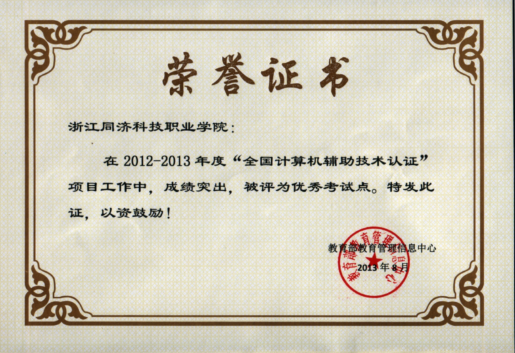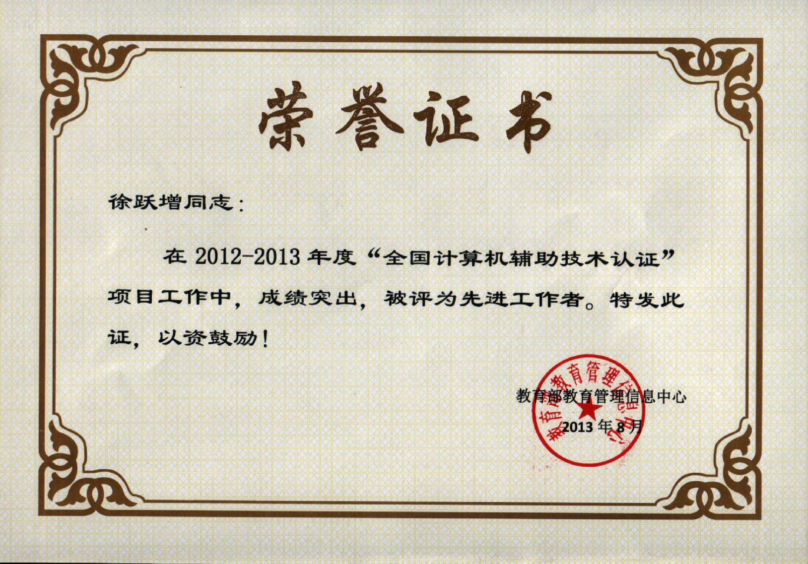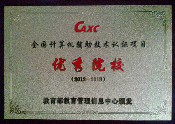 全国计算机辅助技术认证项目(简称CAXC项目)2013年度工作会议暑期在山东青岛召开,会上对CAXC项目上年度工作进行了总结,对先进集体和个人进行了表彰。我院因表现突出,被教育部教育管理信息中心授予2012-2013年度“全国计算机辅助技术认证项目”优秀院校和优秀考试点荣誉称号,也是全国600余个考点中27个优秀考点之一。迄今我院已经连续两年获得此项荣誉。机电系徐跃增老师在此项工作中成绩突出,被评为优秀教师和先进工作者。