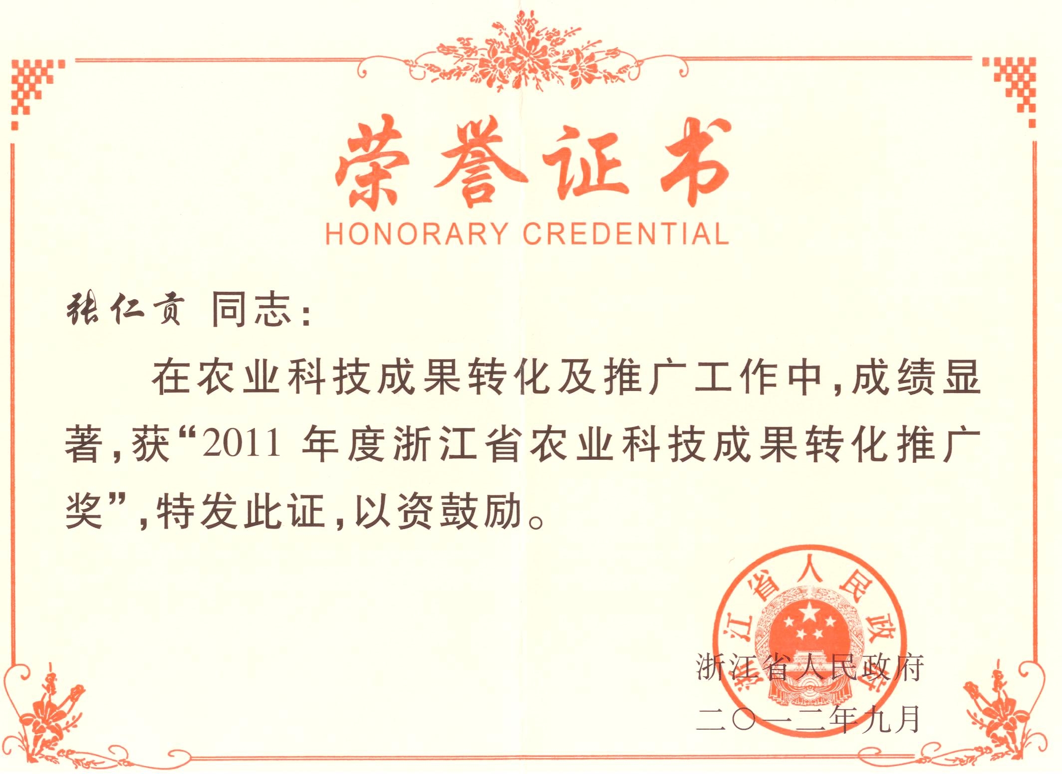 日前,由浙江省人民政府下发的《2011年度浙江省农业科技成果转化推广奖的通报》(浙政发〔2012〕72号)表彰了我省在农业科技成果转化推广方面有突出贡献的科技工作者,我院机电系教师张仁贡榜上有名。