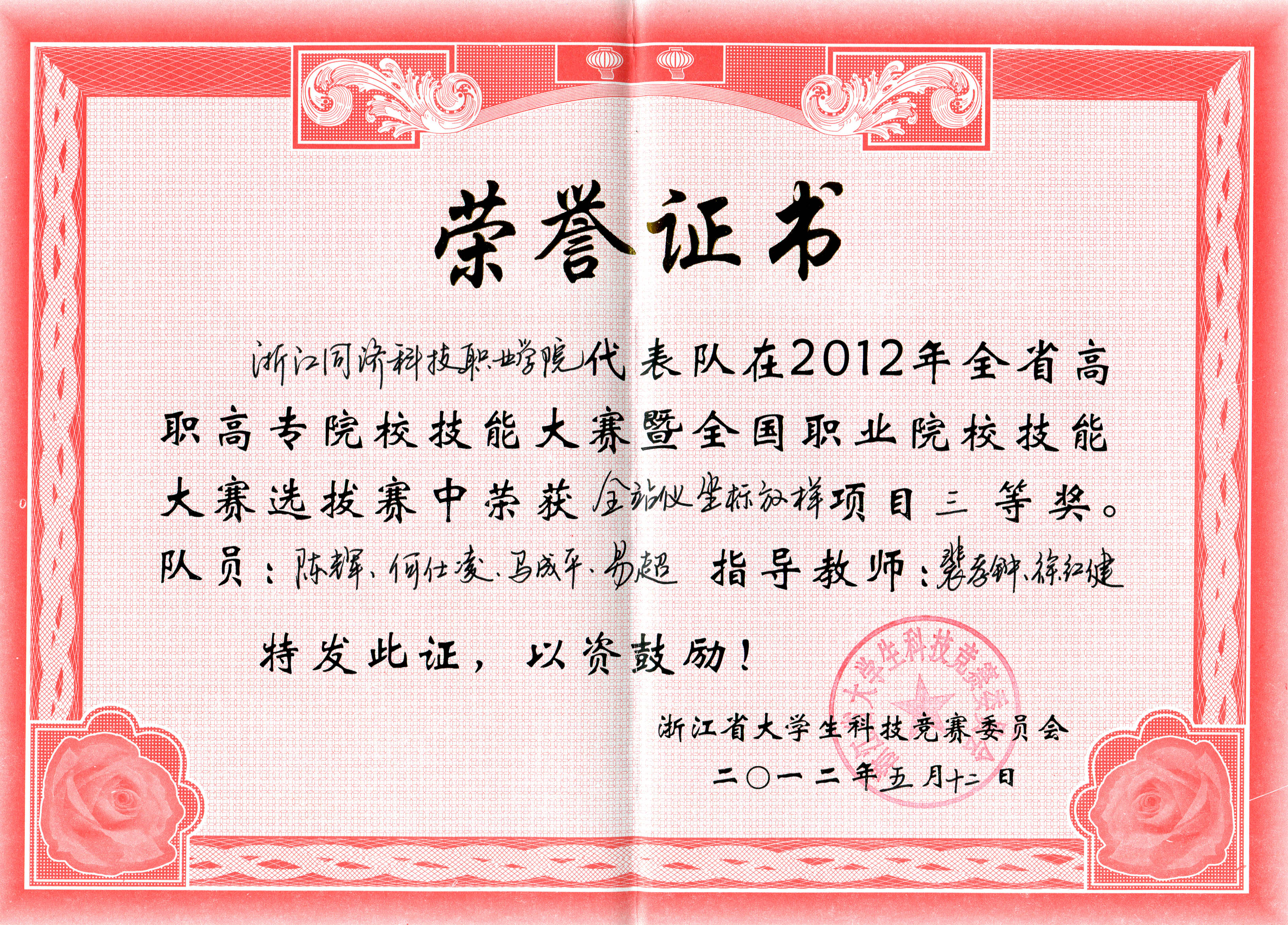 5月11~13日,由浙江省教育厅主办,浙江建设职业技术学院承办,杭州天地测绘技术有限公司、浙江天煌科技实业有限公司协办的2012浙江高职高专院校技能大赛暨全国职业院校技能大赛选拔赛顺利落下帷幕。本次大赛历时3天,共有来自全省14所高校、5个大项共34支队伍参赛。我院也派出了师生参赛。其中,水利系工程测量与监理10-01班陈尊艺、陈闽汉、刘斌、柳策策获得了“二等水准测量”三等奖、“一级导线测量”三等奖、“团体总分”三等奖;工程测量与监理11-01班陈辉、马成平、何仕凌、易超获得了“全站仪坐标放样”三等奖;工程测量与监理11-02班黄霏、方凯、沈海峰、卢永炎获得“二等水准测量”二等奖,“一级导线测量”三等奖。
