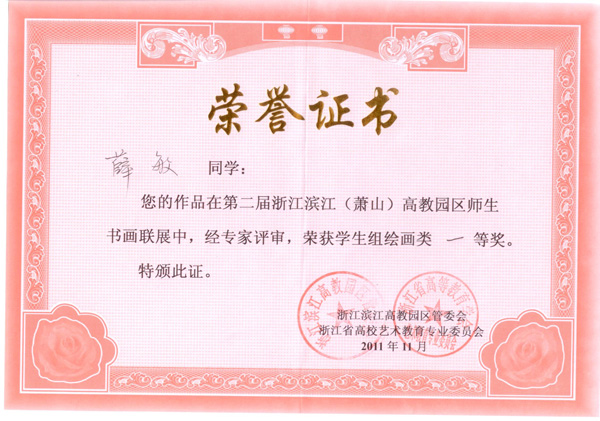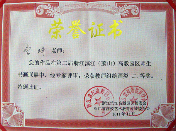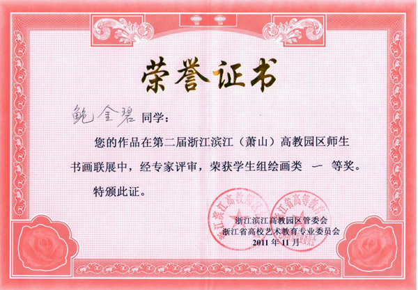 11月24日,在浙江机电职业技术学院召开的首届滨江(萧山)高教园区文化建设研讨会暨第二届滨江(萧山)高教园区师生书画作品展开幕式上传来好消息,我院艺术系师生参评的书画作品取得了佳绩: