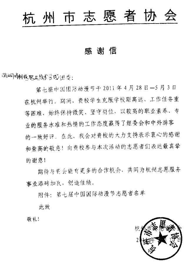 我院团委收到杭州市青年志愿者协会的感谢信