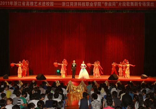 5月12日晚上18:30,2011年高雅艺术进校园浙江歌舞剧院歌舞剧《李叔同》片段在我院文体活动中心篮球馆隆重上演。我院1300余名师生到场观看了演出。