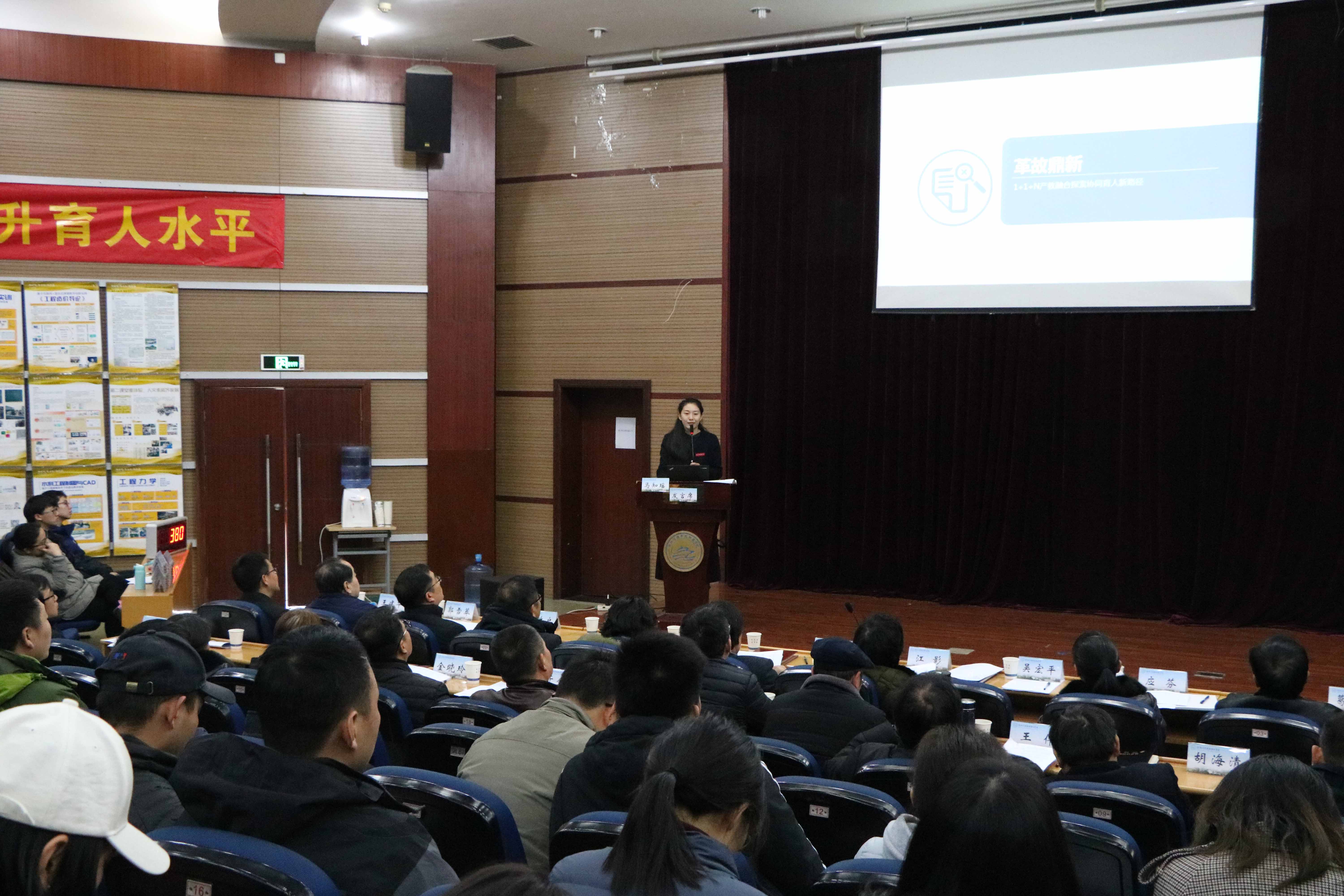 现场汇报评比得到了老师们的高度关注和参与,学院全体院校领导和教学工作委员会成员担任评委,全体专兼职教师到场学习。在主持人王建华副校长的开场词之后,汇报评比开始。学院10位专业部(教研室)主任选取本专业产教融合育人、创新人才培养、专业认证、专业特色文化等其中一个方面阐述了专业改革实践、成效及亮点特色;10位课程教师分别展示了所执教课程的课堂教学改革实践及成效特色。老师们利用现代信息技术手段各显神通,在完美阐述了汇报内容的同时也展示了高超的“互联网+”教学水平,获得了阵阵掌声。