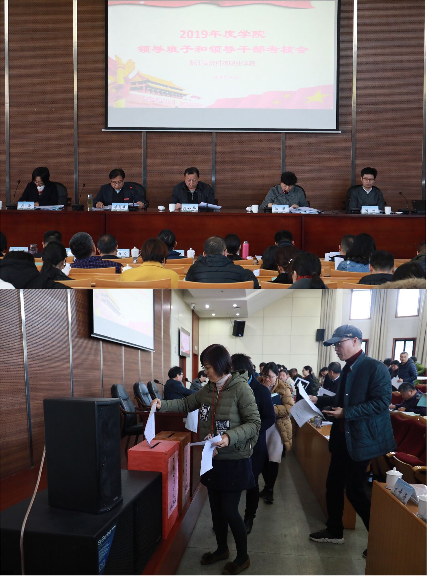 会上,学院党委书记江影代表学院领导班子和个人作了述职报告,院长梁国钱作了个人述职报告,领导班子其他成员书面作了述职述德述廉述法报告。江影书记在报告中指出,2019年度院领导班子带领全院师生牢牢把握立德树人根本任务,按照学院第二次党代会制定的发展目标,较好的完成了年度各项目标任务。同时成功举办了60周年校庆暨全国水利教育德育论坛、正式揭牌南浔产教融合基地,在思政教育、校园文化等方面均有省级以上的成绩突破。同时,她指出,面对扩招等新形势新要求,全体教职员工要团结一心,安定笃干。
