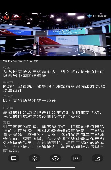 播放当天,全体在校学生,学院领导、宣传部、学工部、思政部全体人员和辅导员通过人民网教育频道、人民网人民智云客户端、咪咕视频客户端等多个平台进行了观看。面对大咖们的精彩讲解,师生们专心听讲,认真记笔记,积极思考。课程结束后,学工部组织辅导员联系学生思想教育工作实际开展热议,各系总支通过辅导员、班主任在班级中组织17、18级学生开展讨论,思政部教师组织19级学生通过课堂派、职教云、学习通、QQ群等各种平台,畅谈认识和体会。大家纷纷表示这堂课安排得很及时,受益颇多、有豁然开朗之感,不仅为战胜疫情提供了驱动力,而且激发了师生们强烈的爱国主义热情,引导大家更深刻地认识党的集中统一领导和社会主义制度的优越性,对实现“中国梦”,实现中华民族的伟大复兴充满信心和决心。