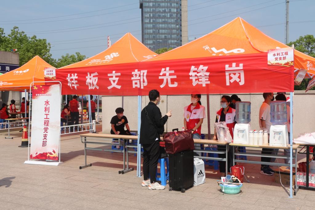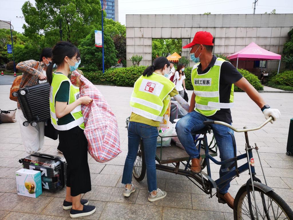 建筑工程系党总支以党员先锋岗为引领,带动全体教师投入志愿服务活动中。刚刚于4月确定为发展对象的朱希文老师,全天奔波在校门口与学生公寓楼之间,为学生搬运行李,闷热的天气让他汗流浃背,一天活动步数达到3万多步。