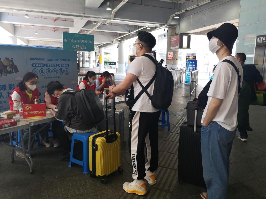 8日一早,19名党员志愿者们已经来到杭州火车东站,迎接归来的学子。从学生出站到站点引导,从体温测量到表格填写,从排队候车到跟车返校,教师们想学生之所想,急家长之所急,继疫情期间担任“网课主播”之后,再次转变角色,变身爱心接站人员。