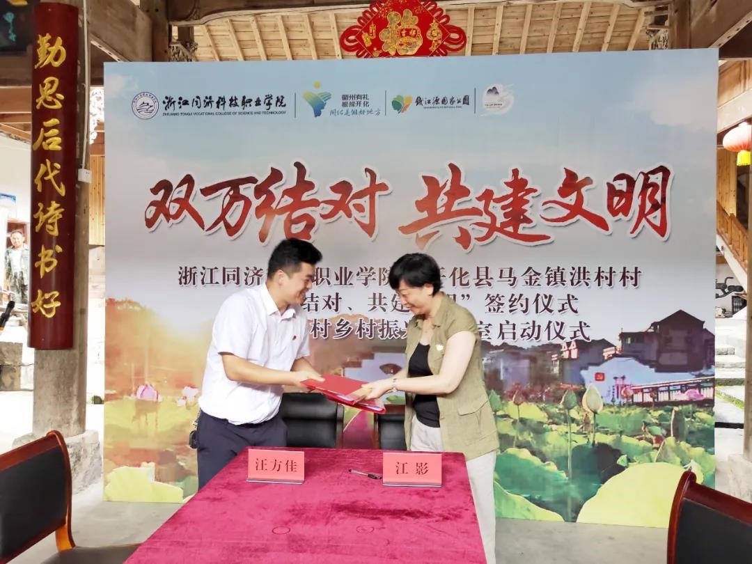 学院党委书记江影与马金镇洪村村党支部书记汪方佳就“双万结对、共建文明”活动签协议书