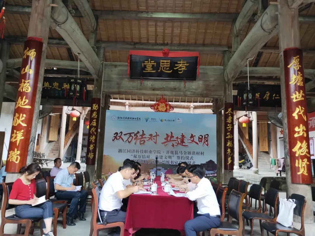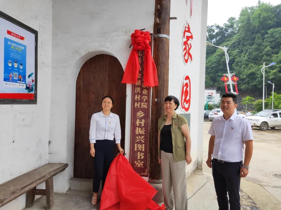 党委书记江影与开化县委宣传部精神文明建设指导中心主任韩原媛共同为学院援建的洪村村“乡村振兴”图书室揭牌