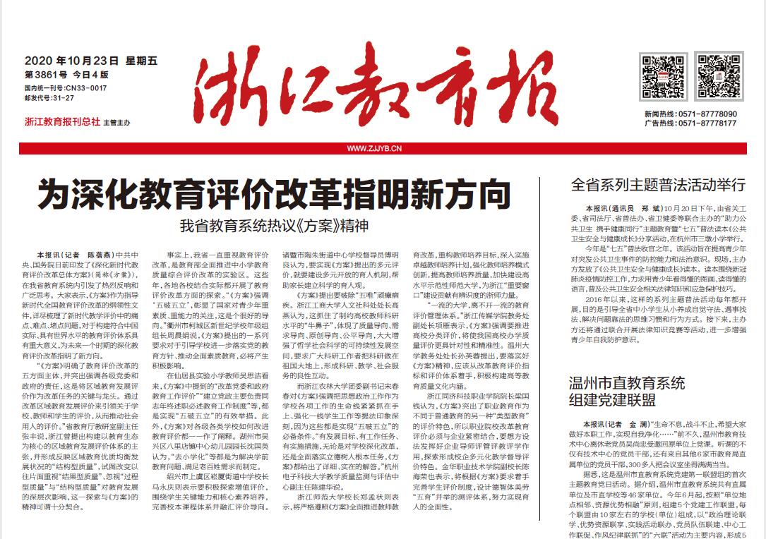 媒体关注:《浙江教育报》头版头条报道我院热议《深化新时代教育评价改革总体方案》