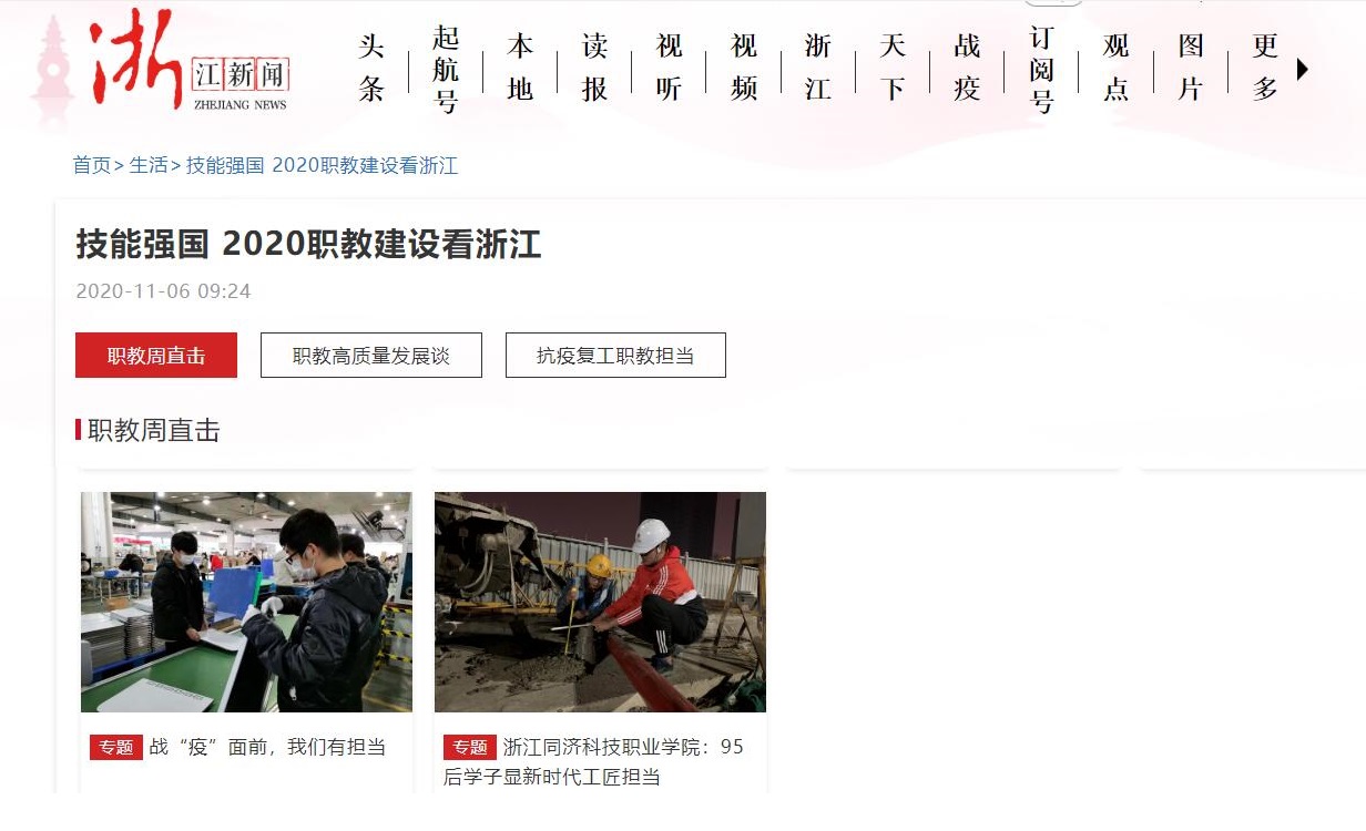 为进一步宣传贯彻中央关于职业教育的重要指示精神,全面展示新时代浙江省职业教育的风采和高技能职业人才发展的良好前景,近日省教育厅举办2020年浙江省职业教育活动周,浙江日报在浙江新闻客户端同步推出“技能强国,2020职教建设看浙江”主题系列宣传,其中深度报道了我院学子在疫情期间大力支持复工复产的事迹。
