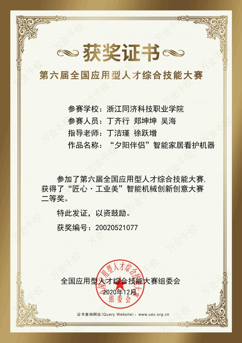 大赛由教育部高校毕业生就业协会主办,高校毕业生就业协会校企合作委员会承办。本届大赛组委会设立“匠心·职场秀”简历精英挑战大赛、“匠心·青春梦”大学生职装创意设计大赛、“匠心·工业美”智能机械创新大赛、“匠心·园丁情”教师创课大赛等四个比赛科目。全国共769所高校,12376支队伍报名参赛。我院机电系一体化技术专业部总结历届竞赛经验,统筹谋划学生竞赛项目,提前组成指导教师团队,发挥社团作用,精心组织学生准备,经过层层选拔推荐,选送“匠心·工业美”智能机械创新大赛4项,经过激烈角逐作品《智能家用机器人》(参赛学生:陈嘉辉单超杰陈鋆辉)《“夕阳伴侣”智能家居看护机器》(参赛学生:丁齐行、郑坤坤、吴海)分别荣获一等奖和二等奖(指导教师团队:徐跃增、蒋帆、丁洁瑾、刘娟、何冀昊)。共有14个作品推荐参加“匠心·职场秀”简历精英挑战大赛,其中王程浩同学《匠心筑梦》获得二等奖,单超杰、蒋应杭、郑坤坤获得三等奖。同时,学院荣获优秀组织奖,蒋帆、丁洁瑾老师获得先进组织个人奖。