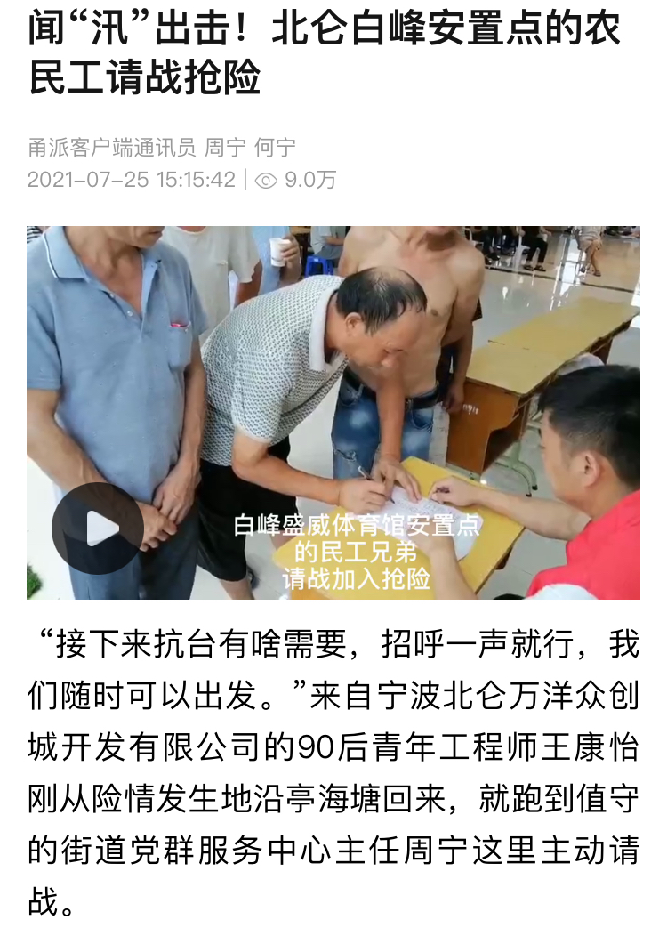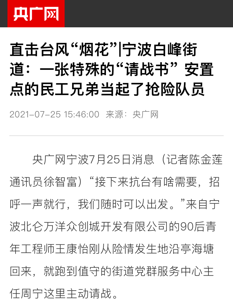 央广网报道:《直击台风“烟花”|宁波白峰街道:一张特殊的“请战书” 安置点的民工兄弟当起了抢险队员》