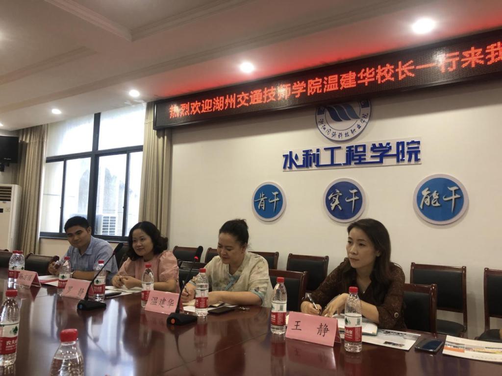 金院长首先对温校长一行的到来表示热烈欢迎,并详细介绍了工程测量技术专业的办学历史、办学规模、专业特色、办学条件及水利工程专业现代学徒制试点经验,并为接下去双方进一步做好“校企合作、产教融合、协同育人”工作提出两点希望:一是加强双方学校交流与沟通,加强五年一贯制专业合作;二是积极深化无人机“1+X”考证工作。温建华副校长对我校的热情接待表示感谢,同时介绍了湖州交通技术学院的办学规模、办学优势、专业教学条件、和创新技能人才培养方式,在现代物流和无人机测绘技术相结合领域提出了自己独到的想法。最后双方就校企协同育人机制及学校之间进行资源、信息的共享达成一致共识。