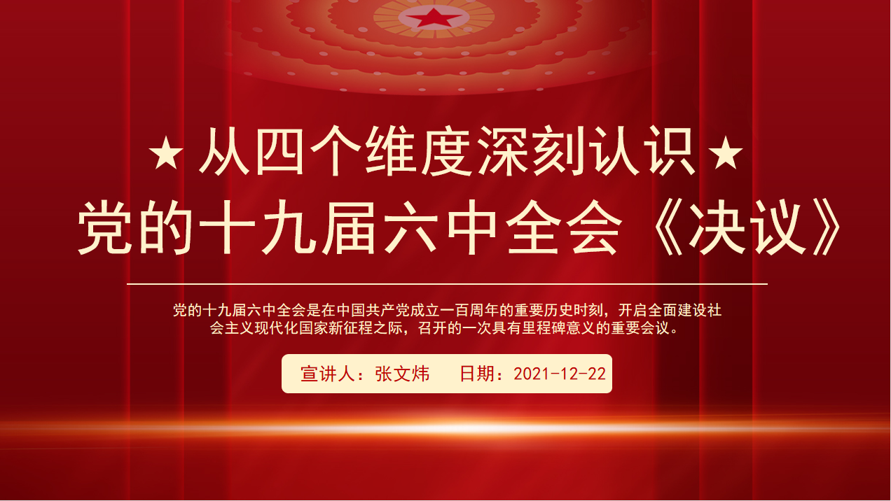 张文炜书记以“从四个维度深刻认识党的十九届六中全会《决议》”为题,从历史与现实相统一的维度来认识《决议》的重大意义,从理论与实践相结合的维度来认识《决议》的理论创新,从经验与精神相交融的维度来认识《决议》的永恒价值,从国内与国际相贯通的维度来认识《决议》的世界影响。