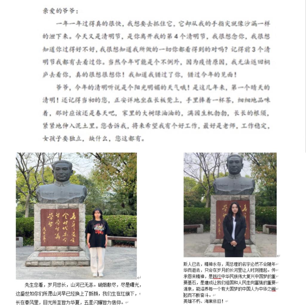 “怀先人”,同学们书写一篇篇寄托思念的文章献给逝去的亲人,慎终追远、不忘先祖的感情在不觉间得到提升。“怀英烈”,同学们通过观看了《长津湖》、《狙击手》等爱国影片,了解历史,追思英烈,从而更加珍惜今天的幸福生活。同学们表示要赓续红色根脉,汲取奋进力量,努力学习,不辜负先辈的期望。“怀伟人”,为深切缅怀周恩来总理,弘扬伟人精神,同学们来到校园内周恩来铜像前合照,并纷纷表达对周总理深深的思想之情。同学们筑梦前行的动力更深。