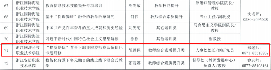 近日,浙江省高校教师教学发展中心联盟高职院校分盟公布了首批教师发展共享项目名单,共72个项目入选。由我校人事处处长、教师教学发展中心主任胡恩保主持的《“提质培优”背景下职业院校师资队伍优化专题研修》项目入选首批教师发展共享项目库,项目成员包括刘进宝、马知瑶、胡玉君和张峰等。