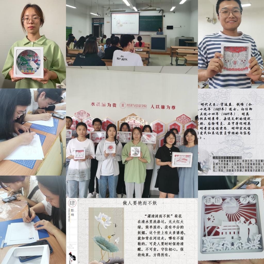 古典诗词不仅在我国的文学艺术领域留下了灿烂光辉,也为廉政文化的思想宝库增添了精神财富。活动过程中,同学们以小组为单位开展“廉洁”诗词赏析,解读廉洁文化的深刻内涵,分享自身的心得感悟。移动商务2101刘锦媛以《石灰吟》中的诗句“粉骨碎身浑不怕,要留清白在人间”,勉励同学们要始终坚持正确的政治立场,坚定理想信念,做到思想上不动摇,行动上不出错,遵守学校各项规章制度和行为道德规范。金融2103席蓓蓓介绍了《咏史》一诗的创作背景和含义,她表明作为一名入党积极分子,更应自省、自警、自励,慎独、慎微、慎欲。在实践环节,同学们动手制作了“廉洁”文化立体纸雕模型,通过一个个构思巧妙,意义深远的手工作品弘扬清风正气,传播廉洁文化。