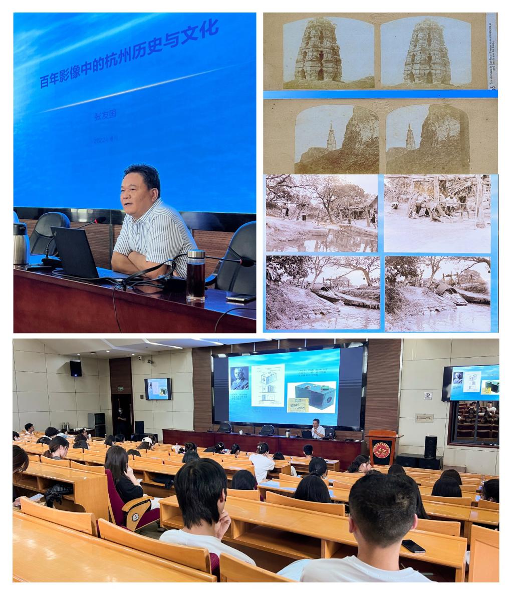 为了丰富美育文化内涵,强化学生对感受美、鉴赏美、发现美、创造美的能力,激发同学们对摄影艺术和杭州人文历史的兴趣,2022年6月10日艺术设计学院在行政楼一楼报告厅举办“百年影像中的杭州历史与文化”的主题讲座。