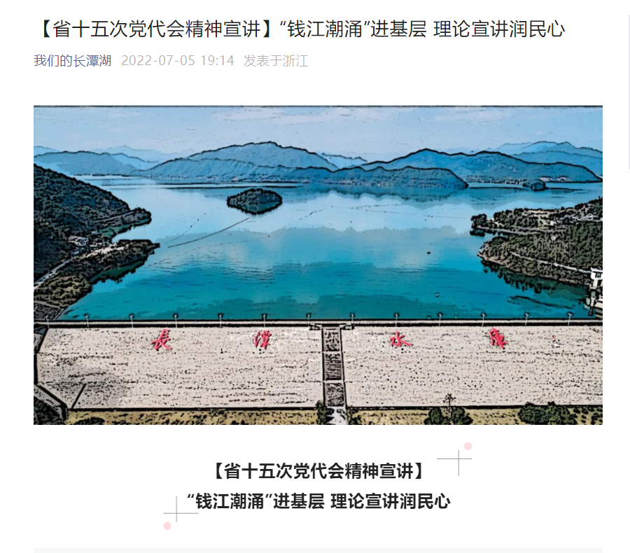“钱江潮”理论宣讲工作室是首批浙江省理论宣讲名师工作室。暑假期间,宣讲团成员带队深入台州市长潭水库、浦江县大畈乡上河村等地进行理论宣讲,他们用歌曲、朗诵、三句半、知识竞答等老百姓喜闻乐见的方式展开宣讲,把省十五次党代会精神传播到田间地头,让广大群众更好地接受新理论、新思想。