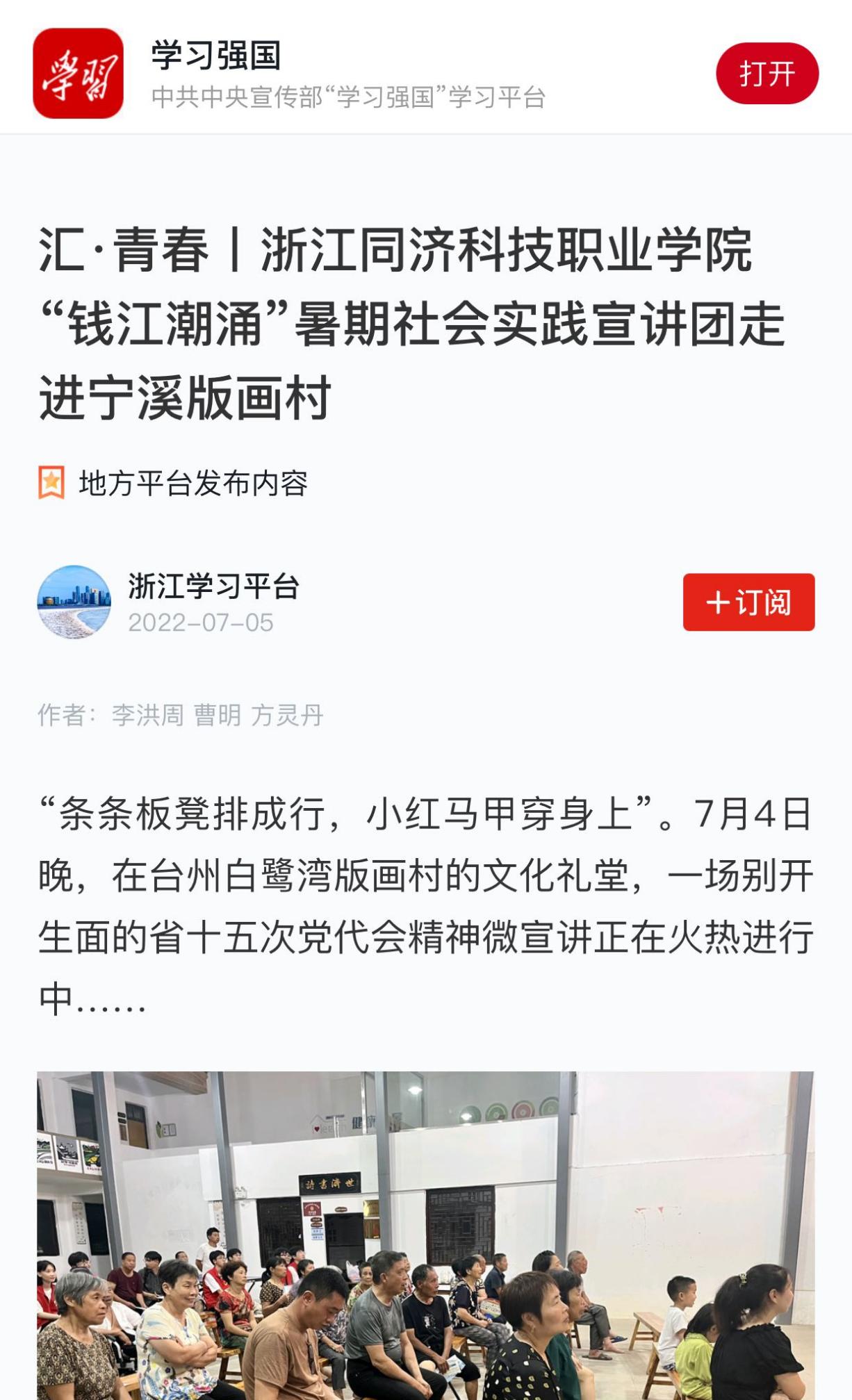 2022年7月5日,学习强国浙江学习平台以《“钱江潮涌”暑期社会实践宣讲团走进宁溪版画村》为题报道“钱江潮”理论宣讲团成员开展的系列宣讲活动。