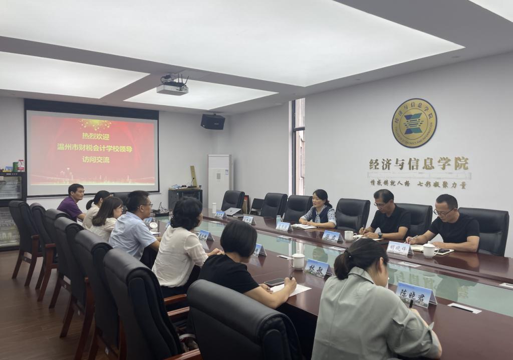 9月23日,温州市财税会计学校党总支书记、校长戴剑锋一行六人应邀来经信学院交流工作。学院院长景秀眉、学生处副处长陈君、大数据与会计专业部主任胡晓锋和专业教师参加了此次交流会谈。