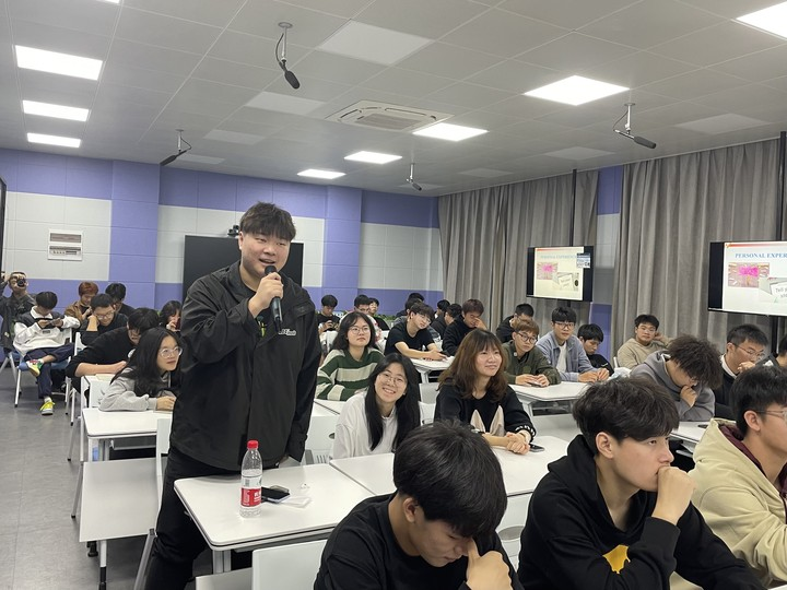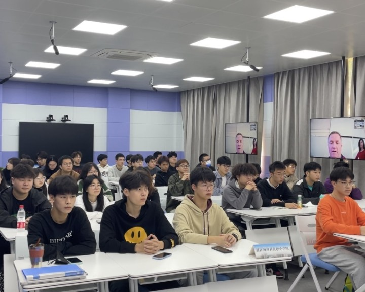 课程中,圣马丁大学三位教授热情地向同学们介绍了学校的不同学科的课程设置。通过研讨学习、案例讲解、小组讨论等教学方式,为学生讲解工程专业内容,整个课堂生动有趣,学生积极参与问答,踊跃发言。两位外籍交换生使用全景模拟技术向同学们介绍了校园规模、作息时间,展示了多样化校园活动与优美的外国风光。中国籍留学生向同学们讲解了入学要求、校园内助理工作、奖学金设置等学生十分关心的问题。我校学生也向美国教授讲述了自己的成长故事,介绍了杭州的美景与中国传统节日等优秀的中华文化。