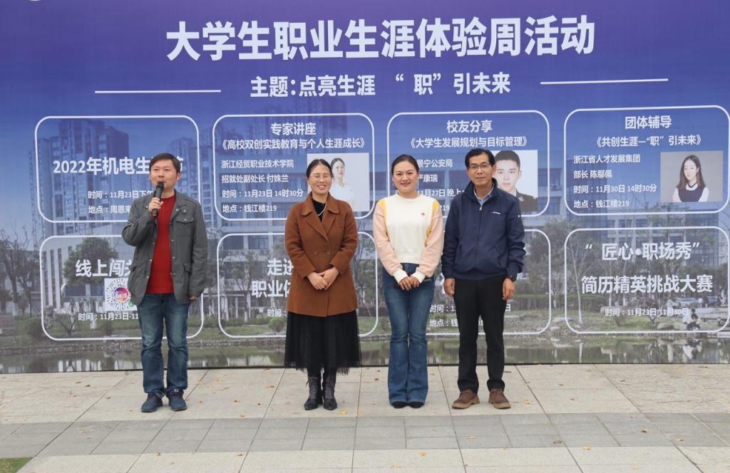 为深入开展大学生职业生涯规划教育,助力学生更好地进行自我认知和职业探索。11月23日下午,机电工程学院在校内广场举办了“点亮生涯职引未来”大学生职业生涯体验周活动启动仪式。学校学生处副处长陈君、机电工程学院党总支副书记章卉,浙江经贸职业学院招就处副处长付姝兰等老师亲临现场进行指导,肯定了本次大学生职业生涯体验周活动在全面激发大学生生涯发展意识,提高生涯教育质量方面的意义和作用。